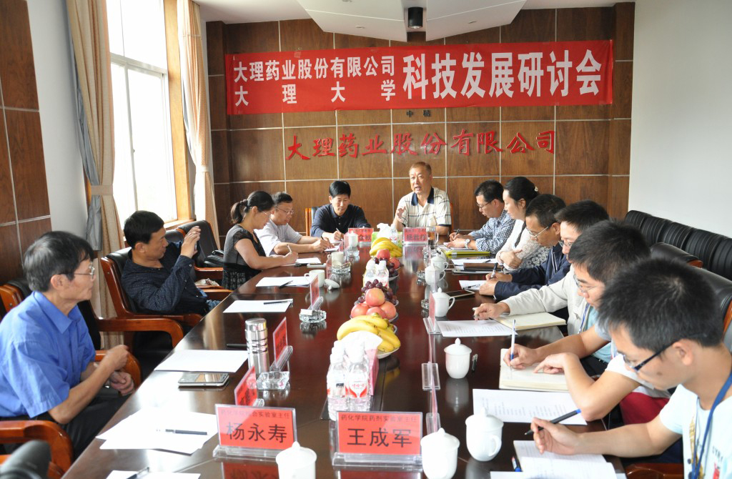 9月19日,大理藥業股份有限公司(以下簡稱“公司”)與大理大學在公司召開了科技發展專家研討會。公司董事長、總經理楊君祥,常務副總經理、董事會秘書李現國,副總經理袁瑋、財務總監李紹雲等公司主要領導出席了會議,雙方就今後如何進一步加強科技發展合作進行了討論,在人才培養、學科發展、科技研發等方麵達成了共識。